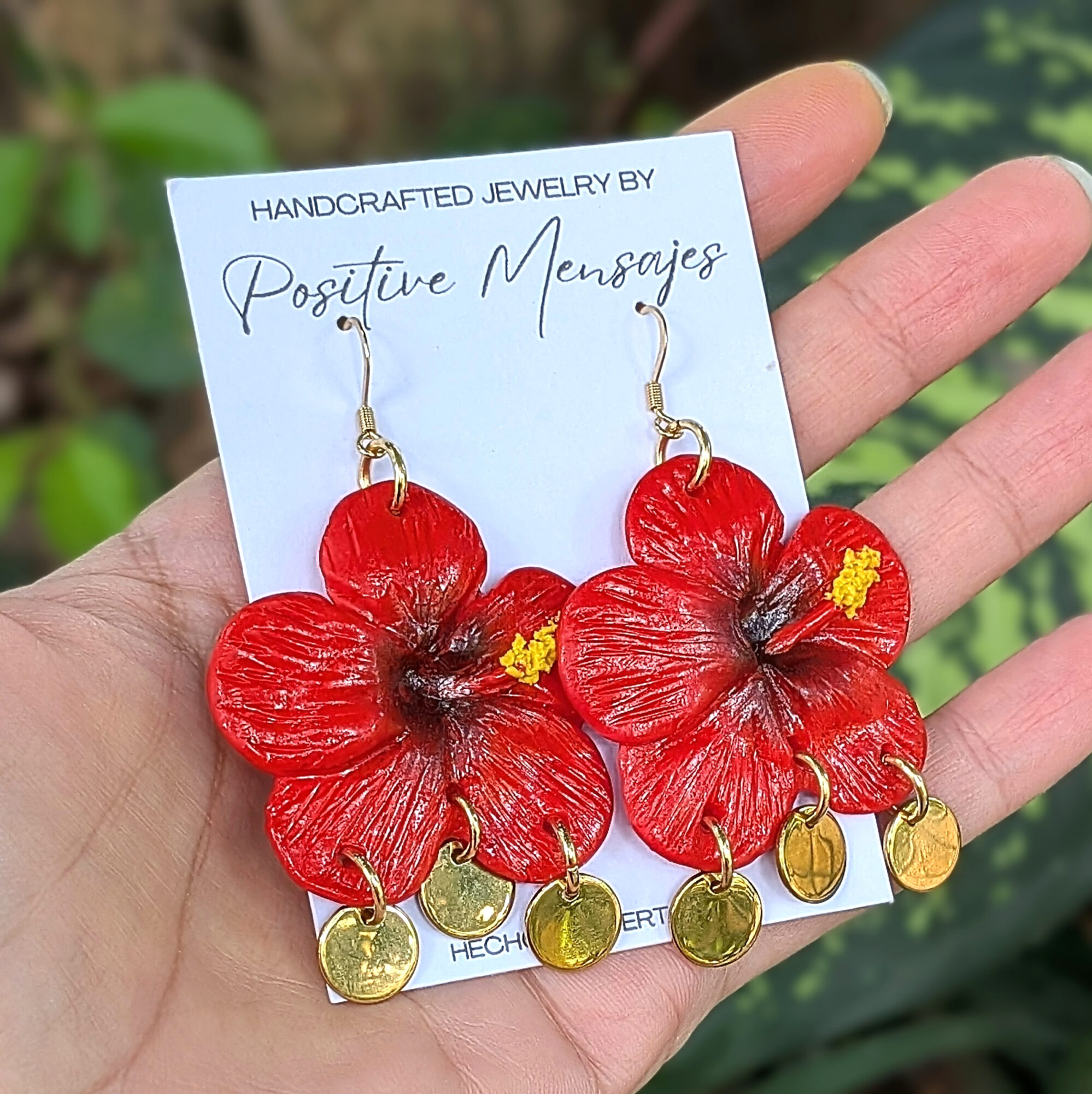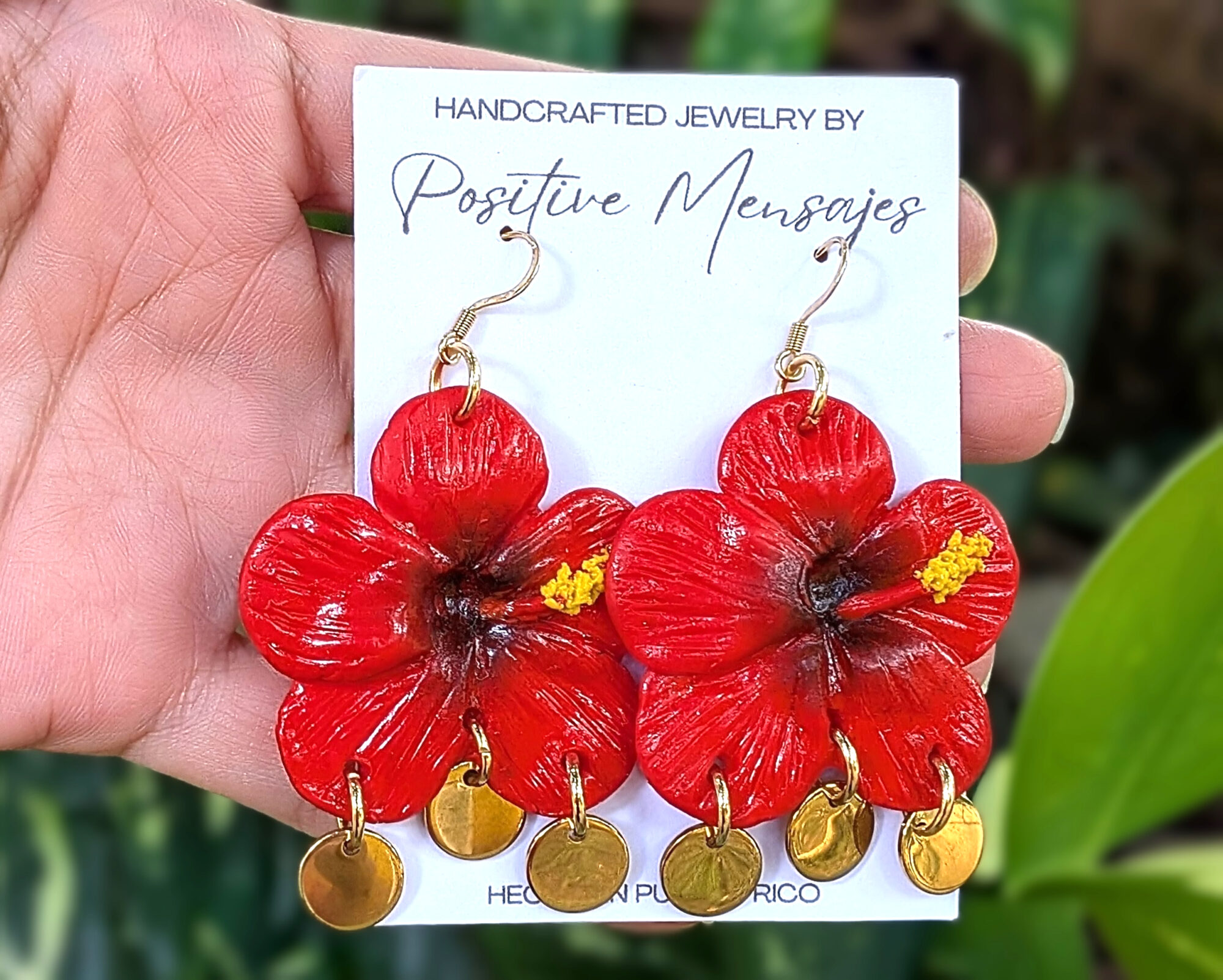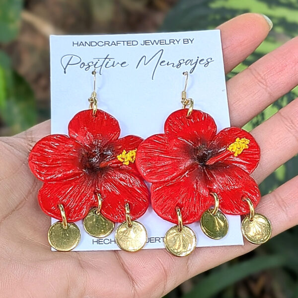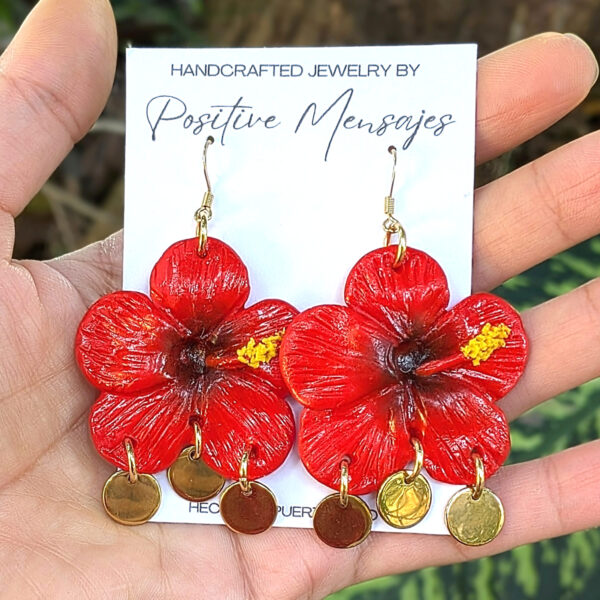 Celebrate the beauty of our island with earrings inspired by the amapola hibiscus and the national Flor de Maga. The red petals with black centers and hints of yellow reflect the colors of Puerto Rico’s beloved flowers. Hand-textured leaves and golden stainless steel round pendants add movement and a playful, feminine, bohemian touch, bringing a little piece of the island into your style.