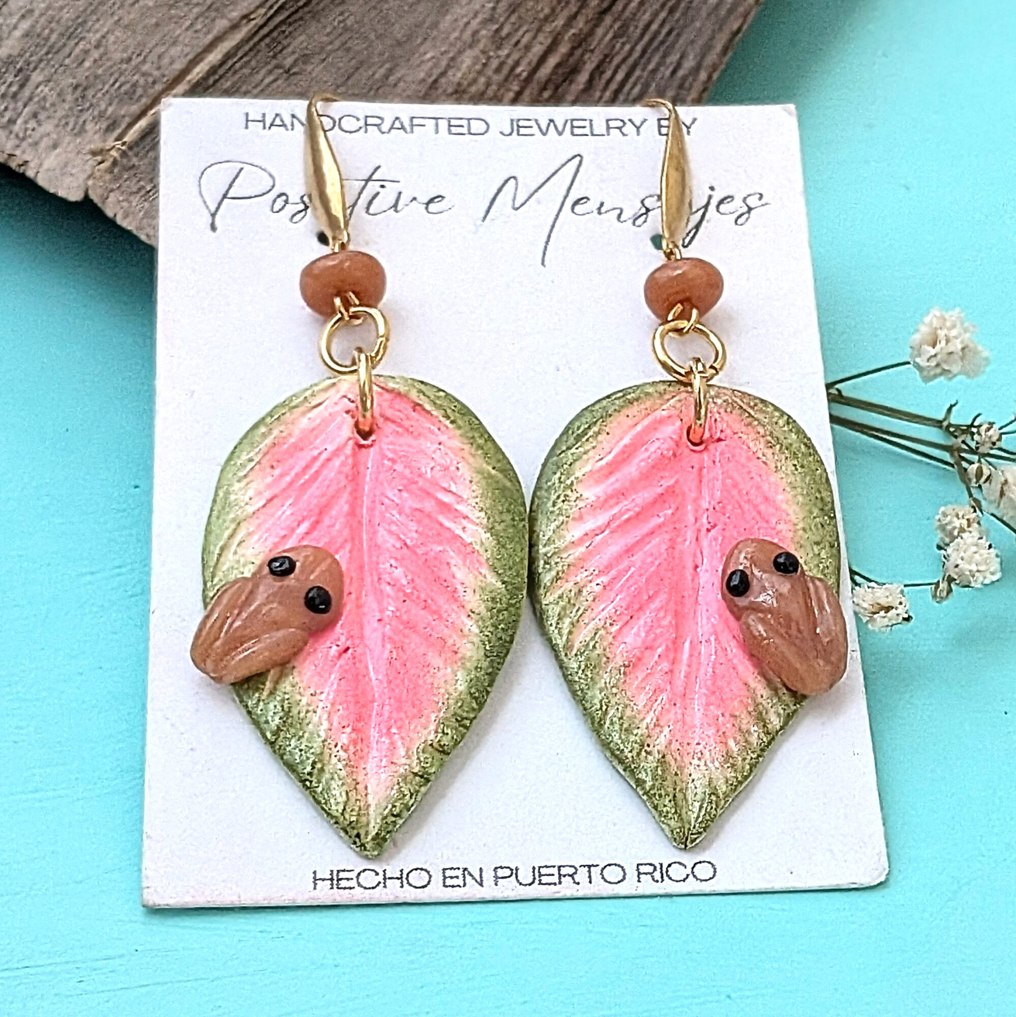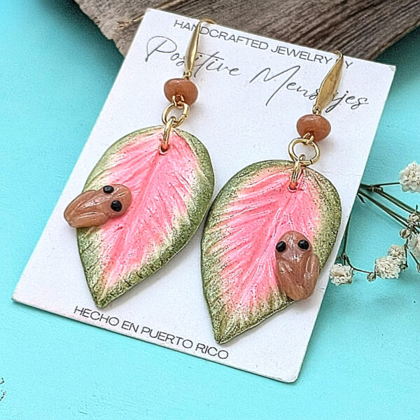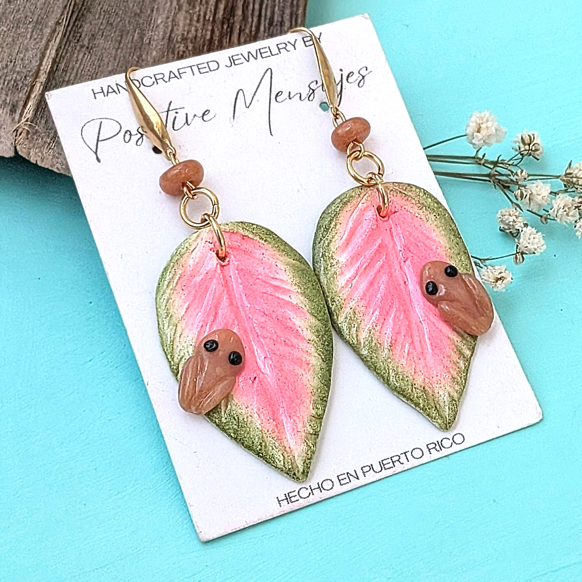 Bringing Puerto Rican nature to life, these handmade leaf earrings celebrate the charming Coquí frog with delicate beads.