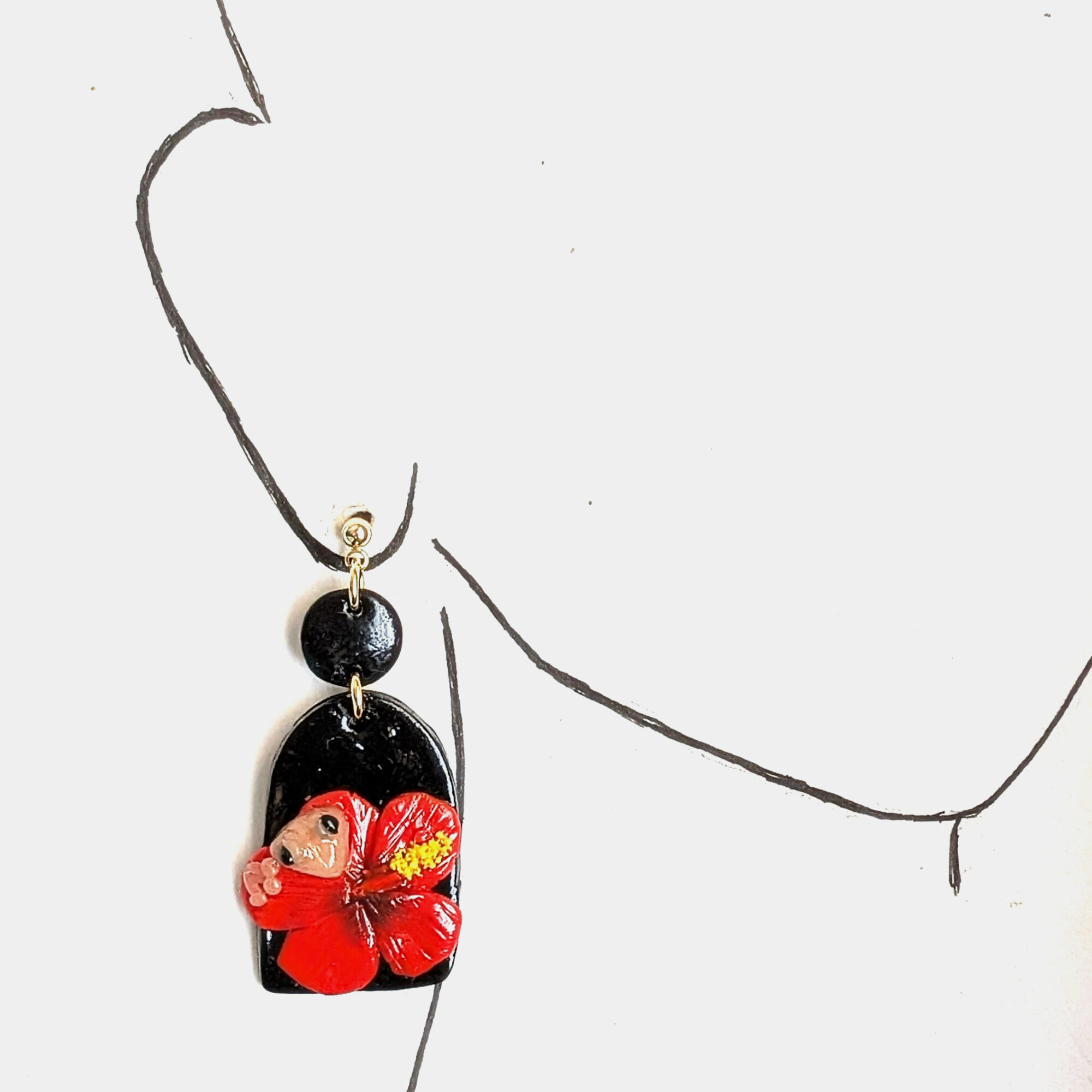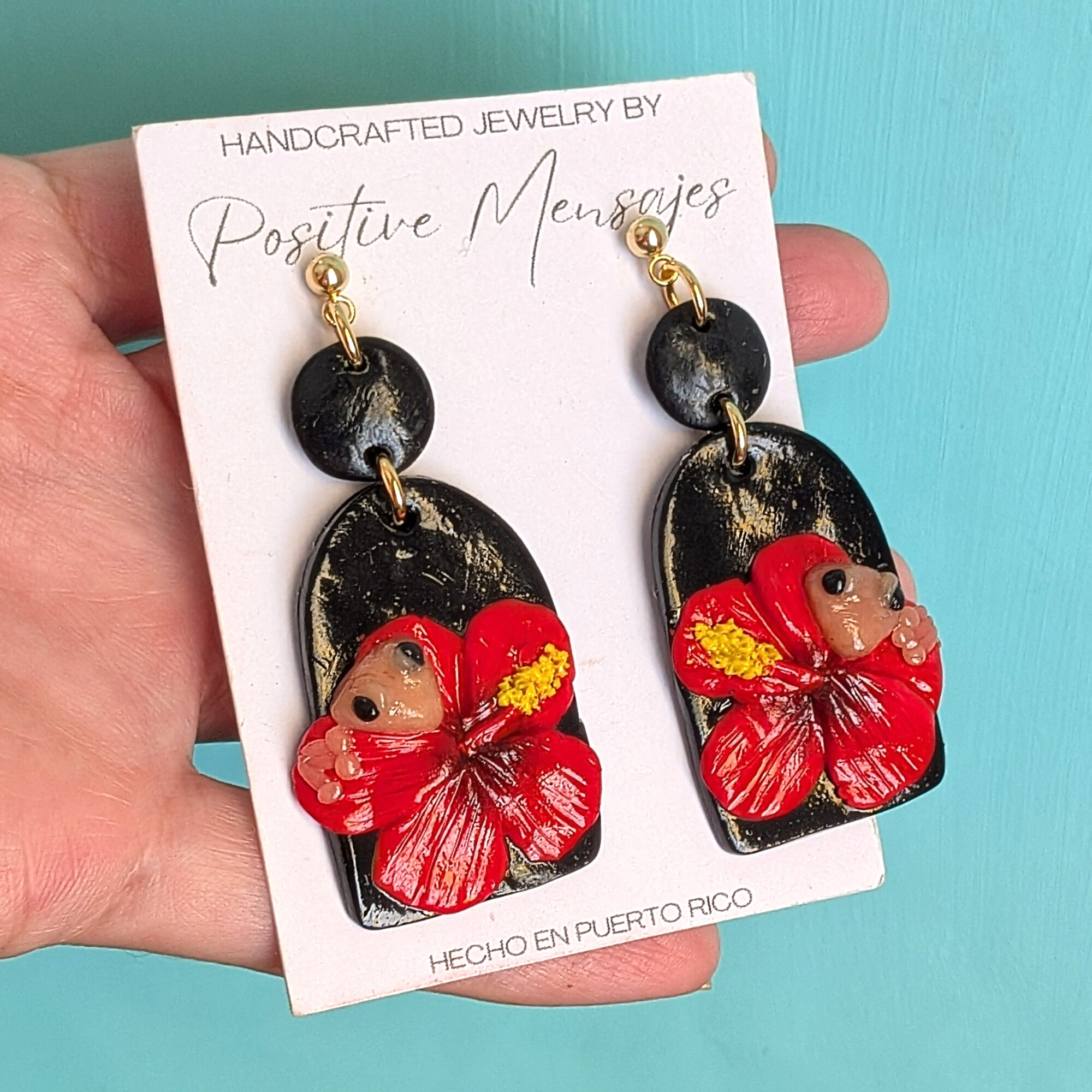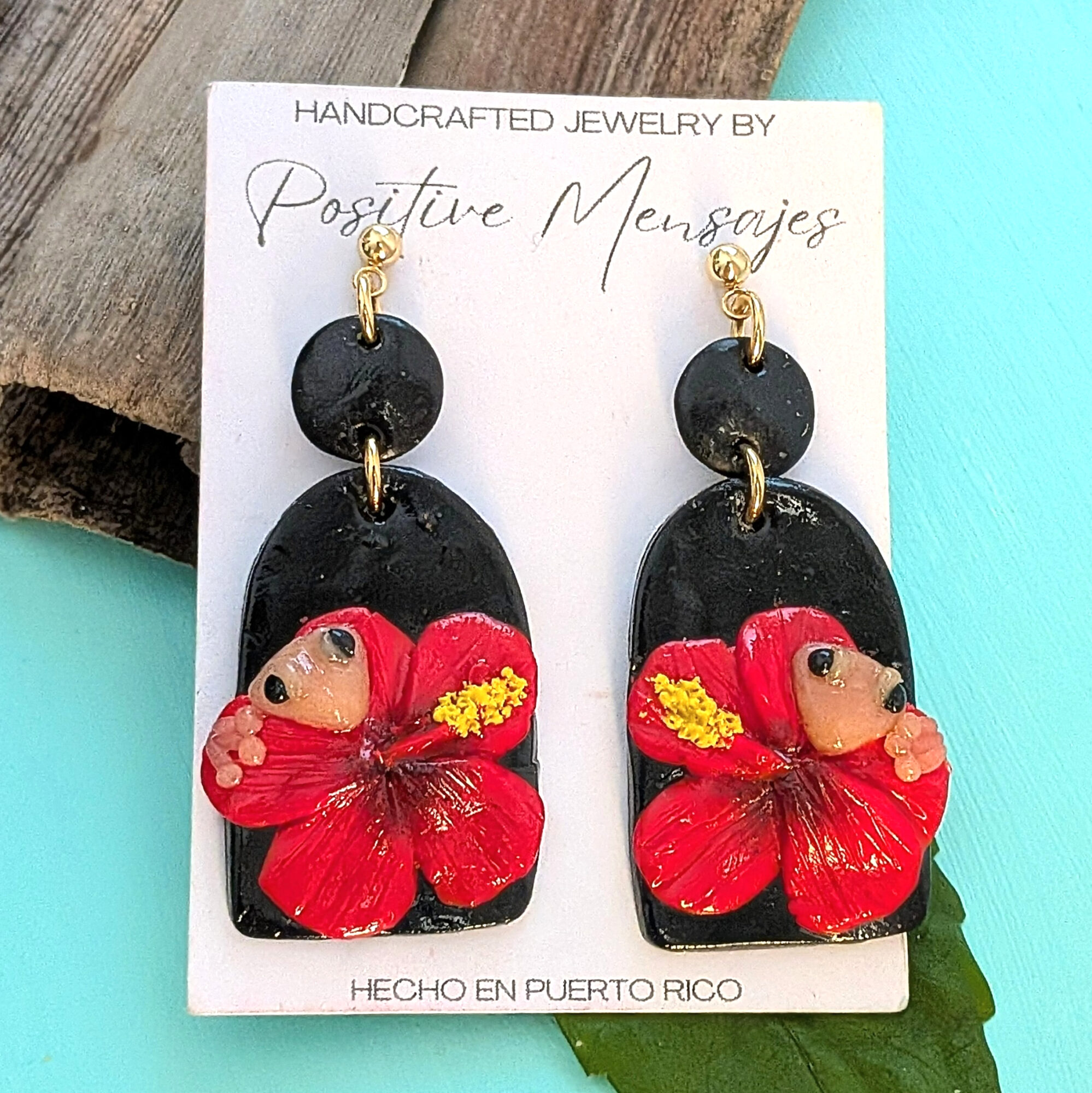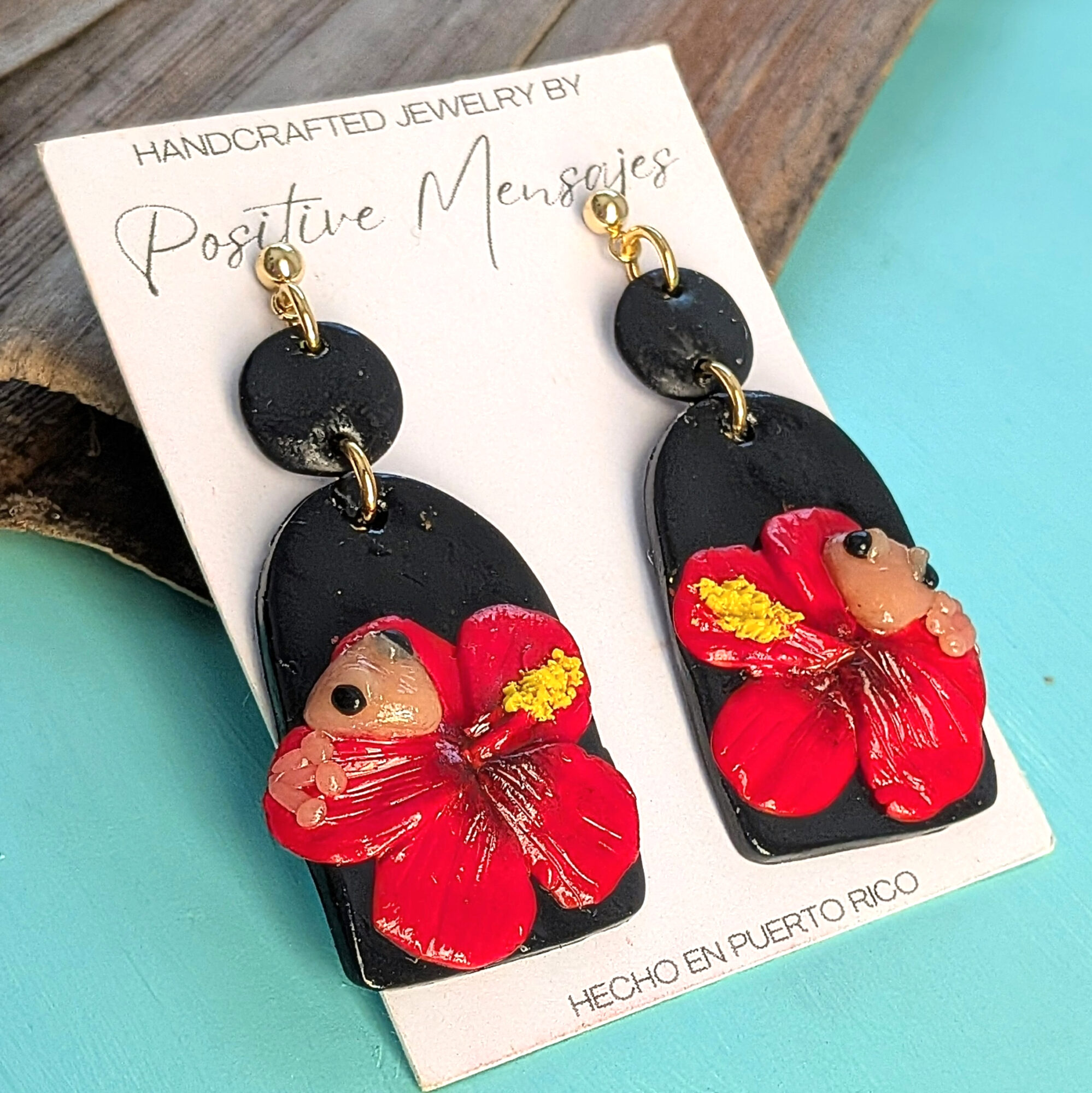 These statement earrings from Puerto Rico feature a curious Coquí frog peeking from our national Flor de Maga and Amapola flower, with its toes playfully displayed. Both the Coquí frog and the red Hibiscus flower represent cherished symbols of Puerto Rican culture. Wear these earrings with pride to express your love for our vibrant Boriquén heritage.