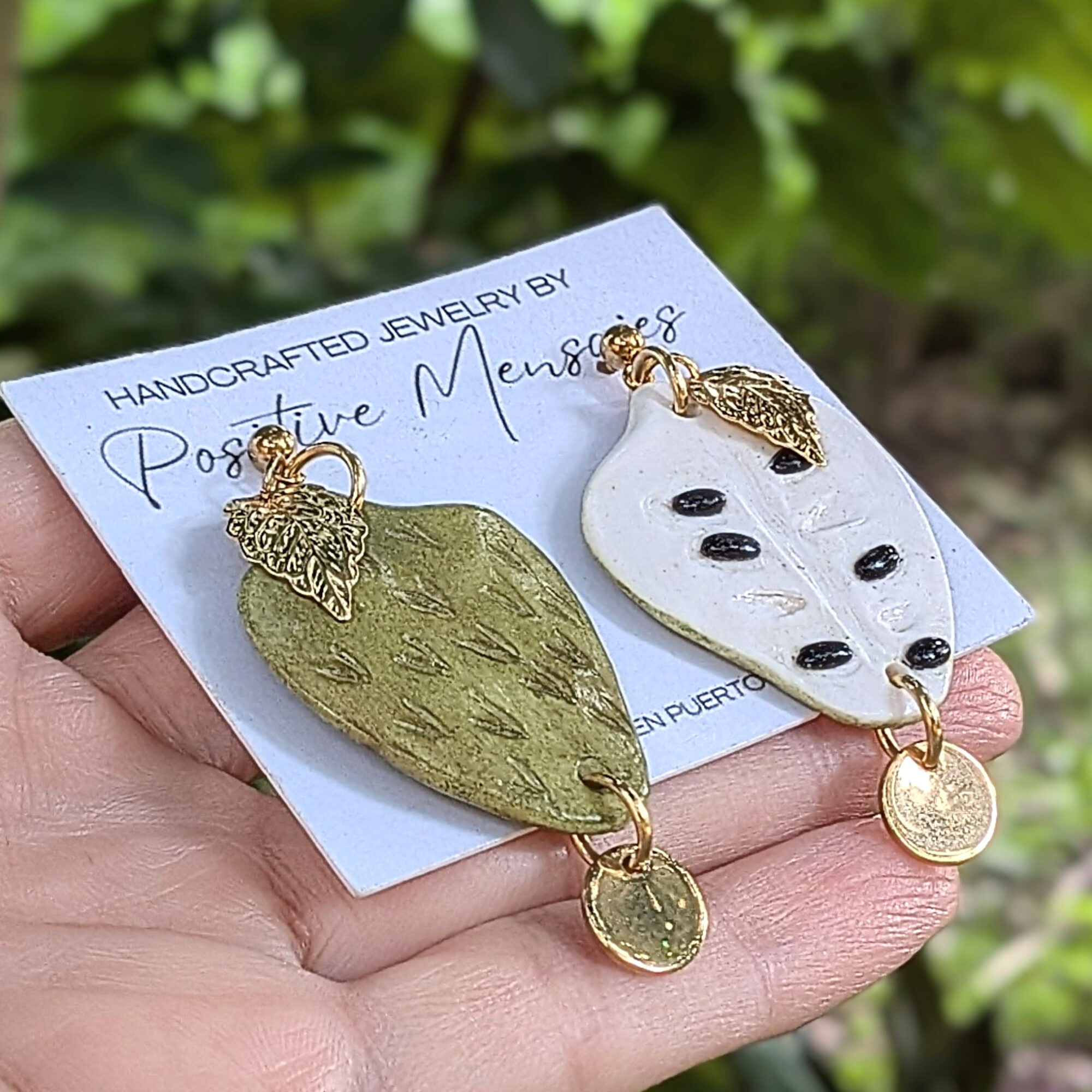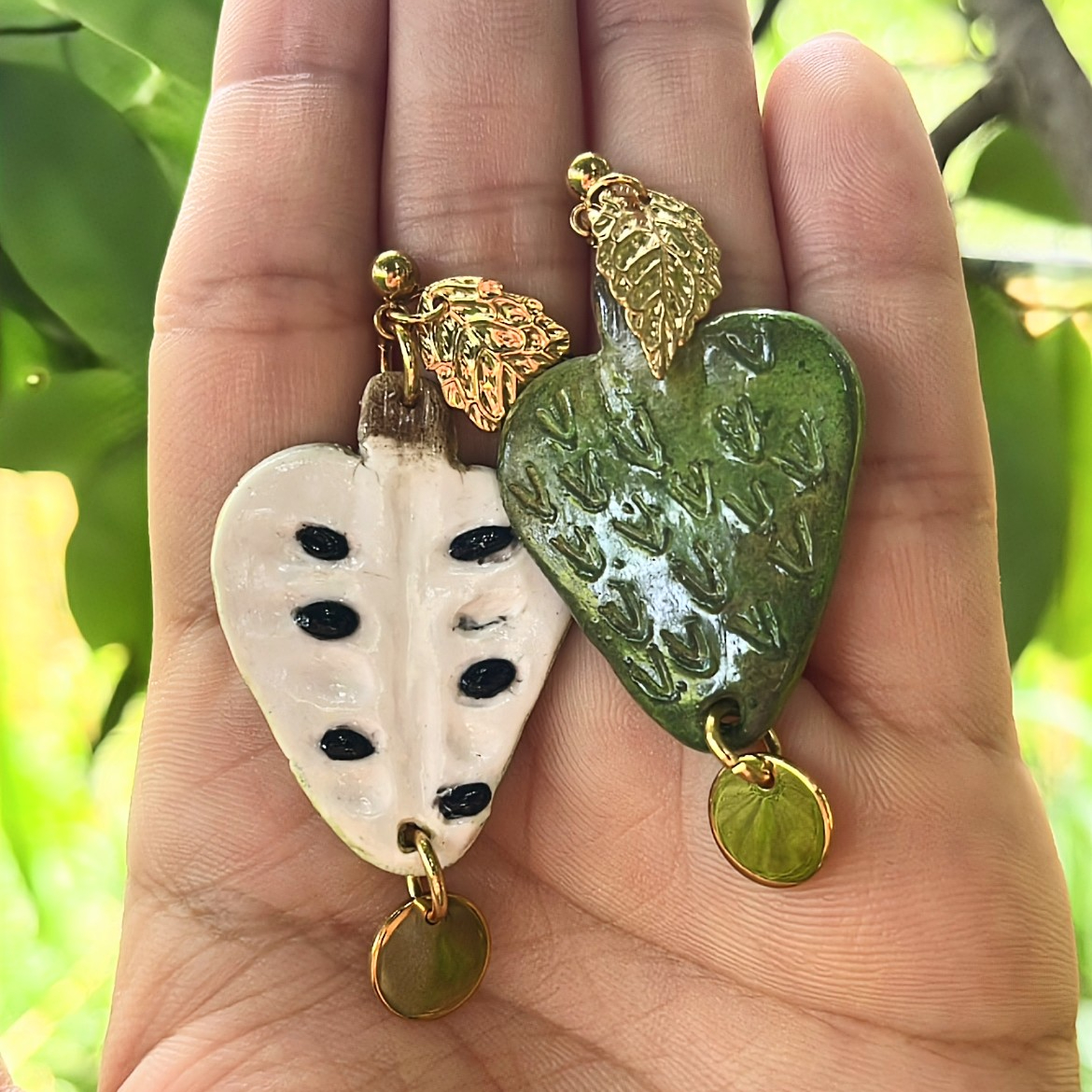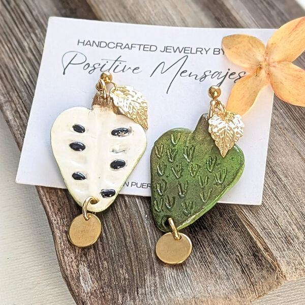 These handcrafted earrings celebrate guanábana (also known as soursop), one of Puerto Rico’s most treasured fruits. One earring reveals the creamy off-white interior with black seed accents, while the other highlights the textured green skin with soft brown shading. Both backs display the whole fruit design. A round pendant hangs from the bottom of each fruit, adding gentle movement and extra charm. The entire design is suspended from golden stainless steel ball post studs topped with a small golden leaf.