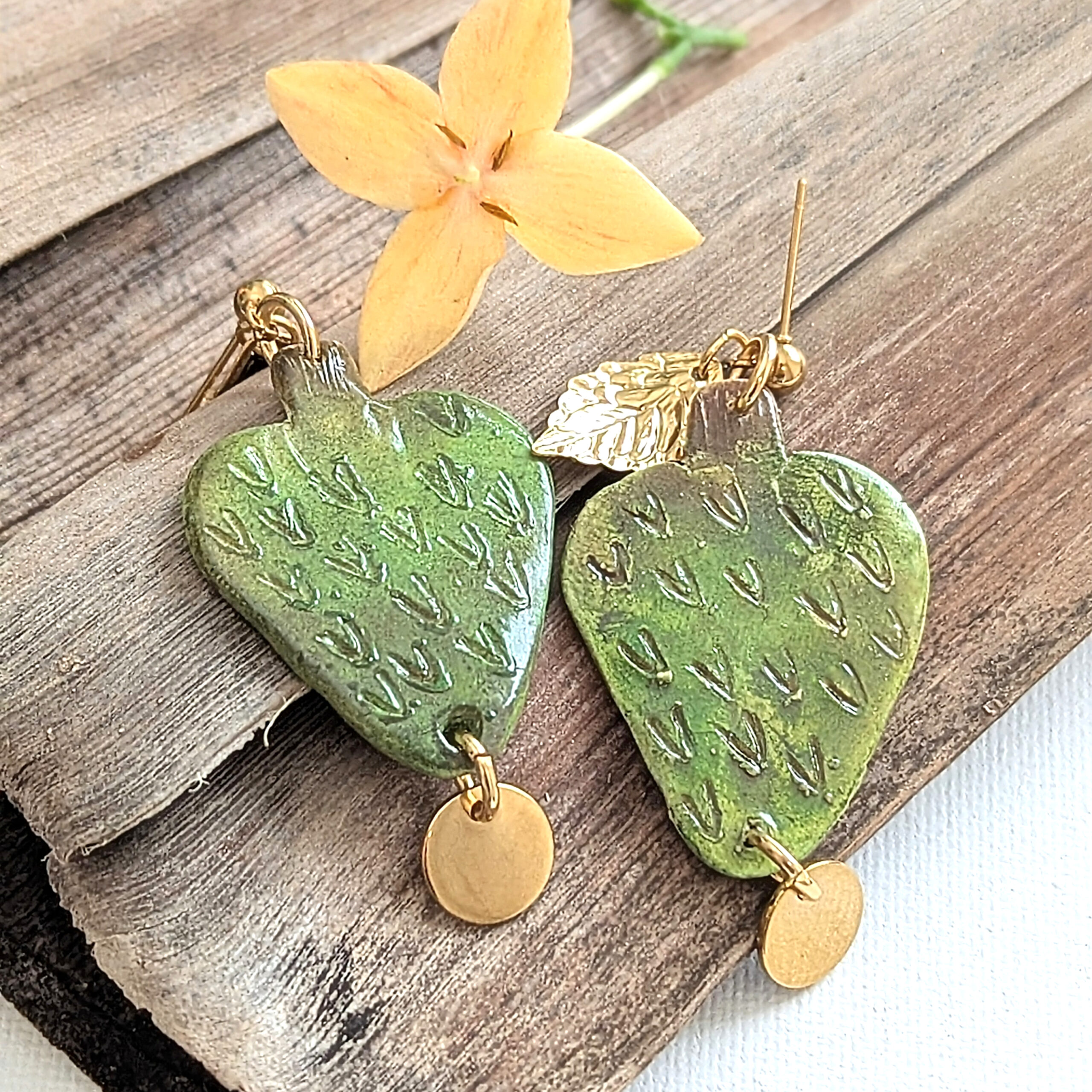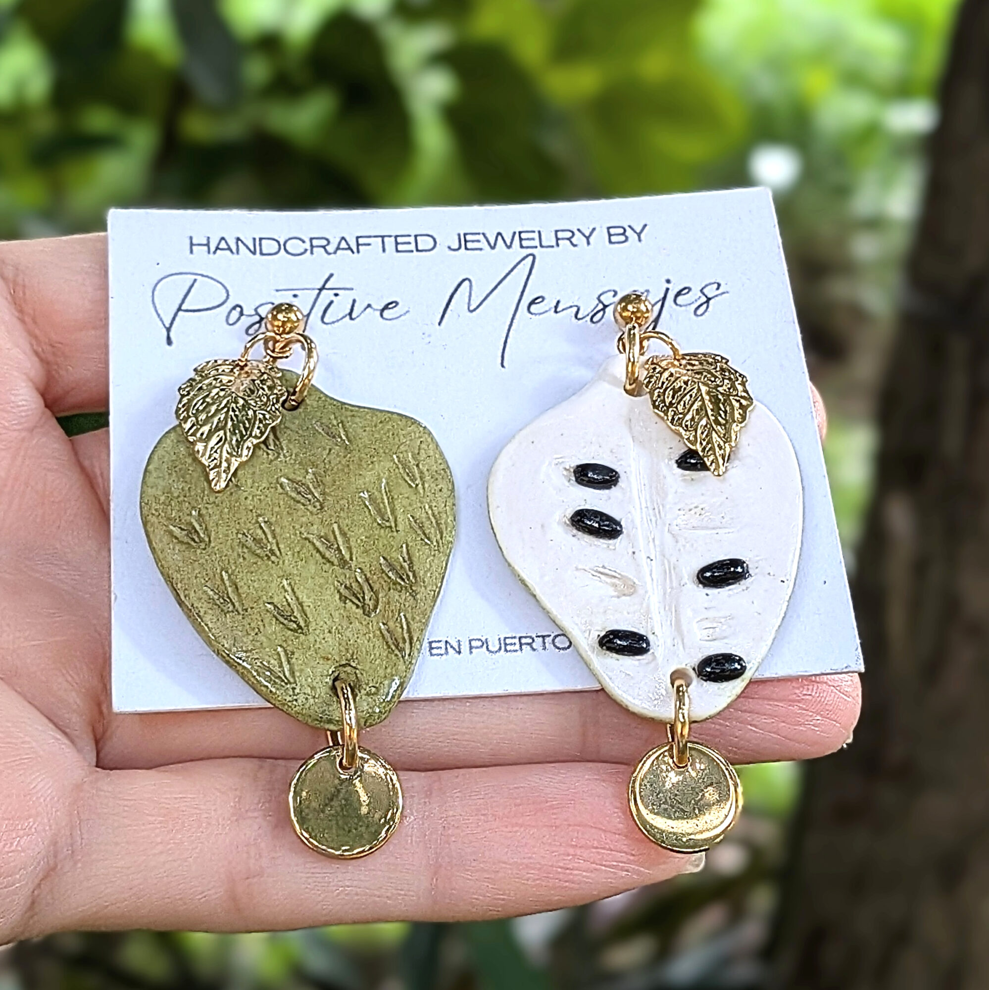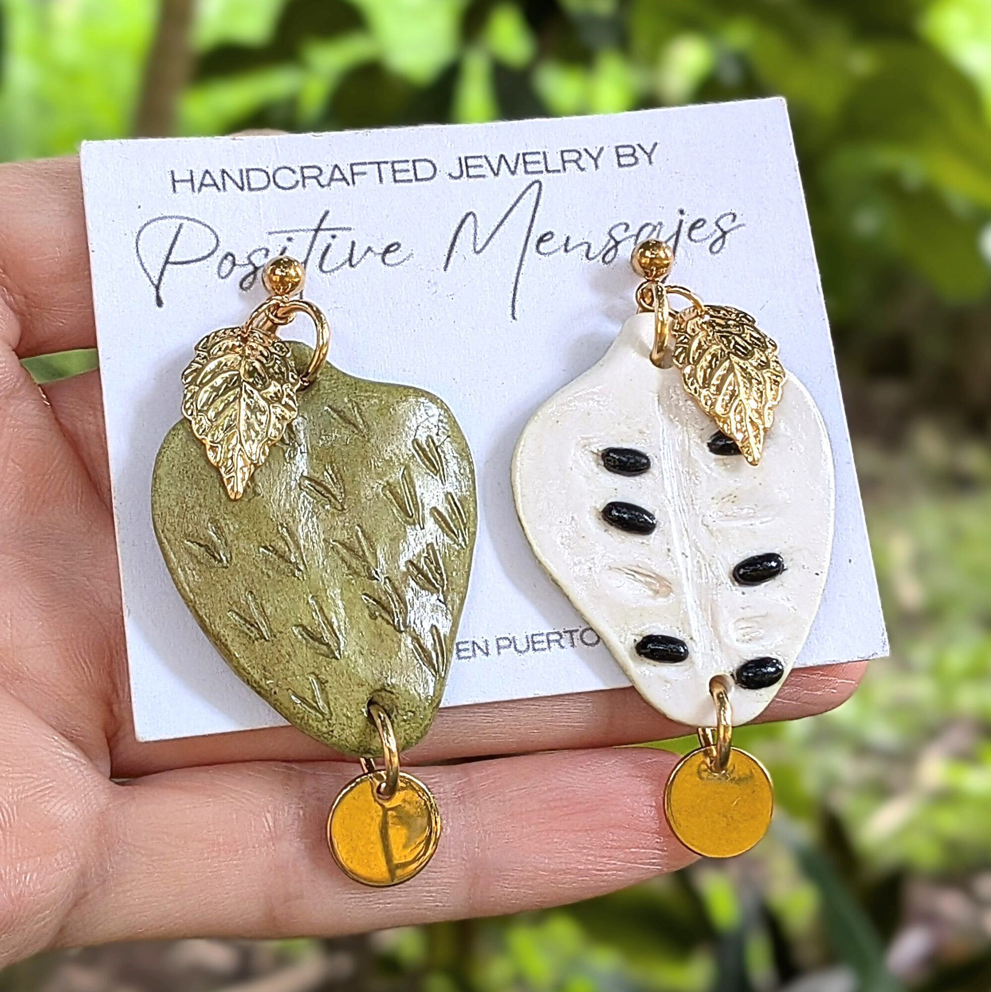 These handcrafted earrings celebrate guanábana (also known as soursop), one of Puerto Rico’s most treasured fruits. One earring reveals the creamy off-white interior with black seed accents, while the other highlights the textured green skin with soft brown shading. Both backs display the whole fruit design. A round pendant hangs from the bottom of each fruit, adding gentle movement and extra charm. The entire design is suspended from golden stainless steel ball post studs topped with a small golden leaf.