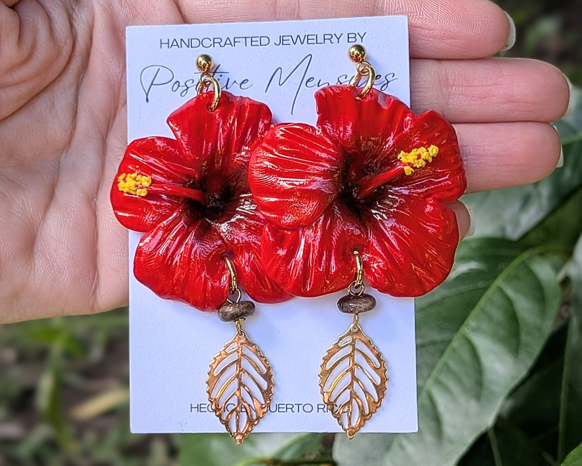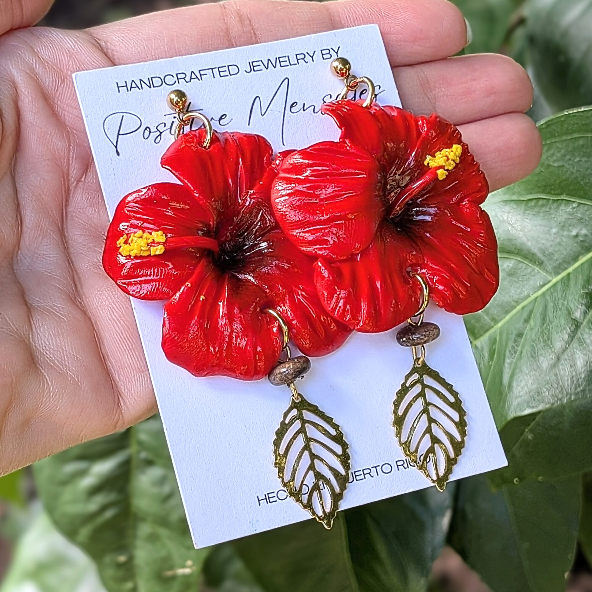 Inspired by the Flor de Maga and the amapola, two of Puerto Rico’s most beloved flowers. These earrings honor our island’s culture with red petals accented in black and yellow. Carefully shaped from polymer clay, each flower is finished with a small brown handmade bead and a golden stainless steel leaf charm. These details add an indigenous touch that connects to our Taíno heritage.