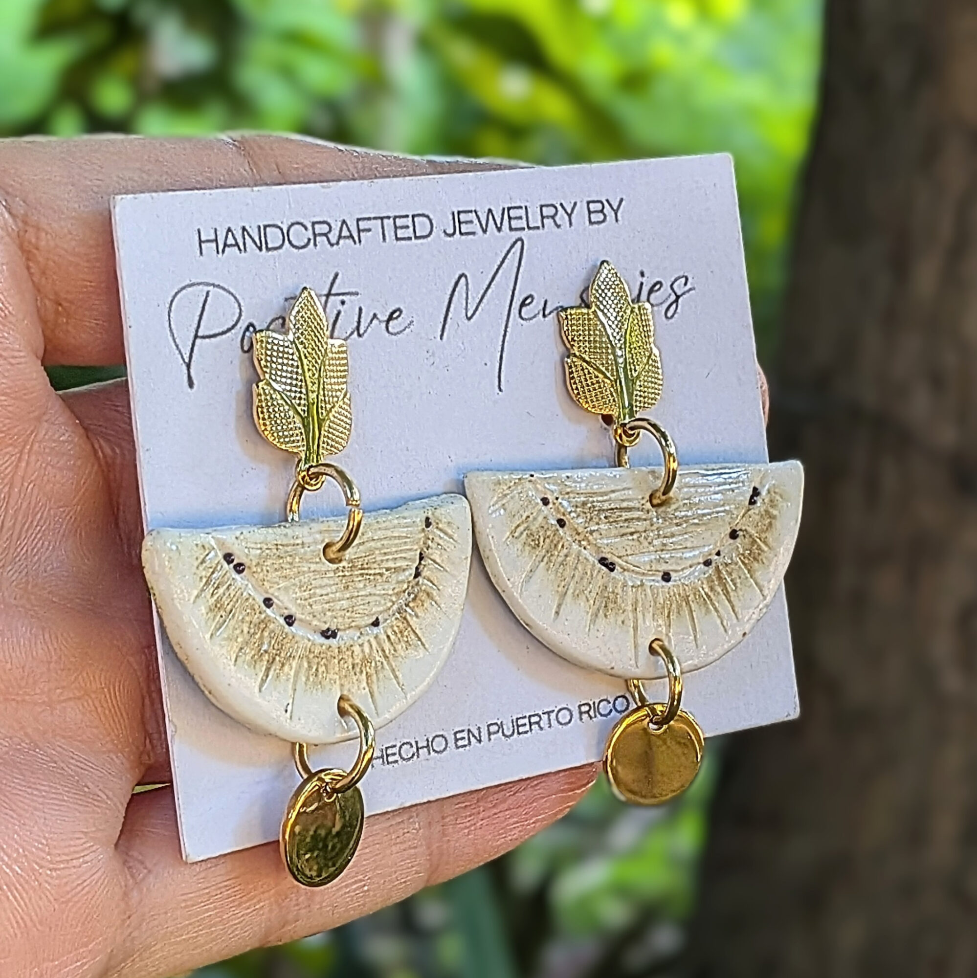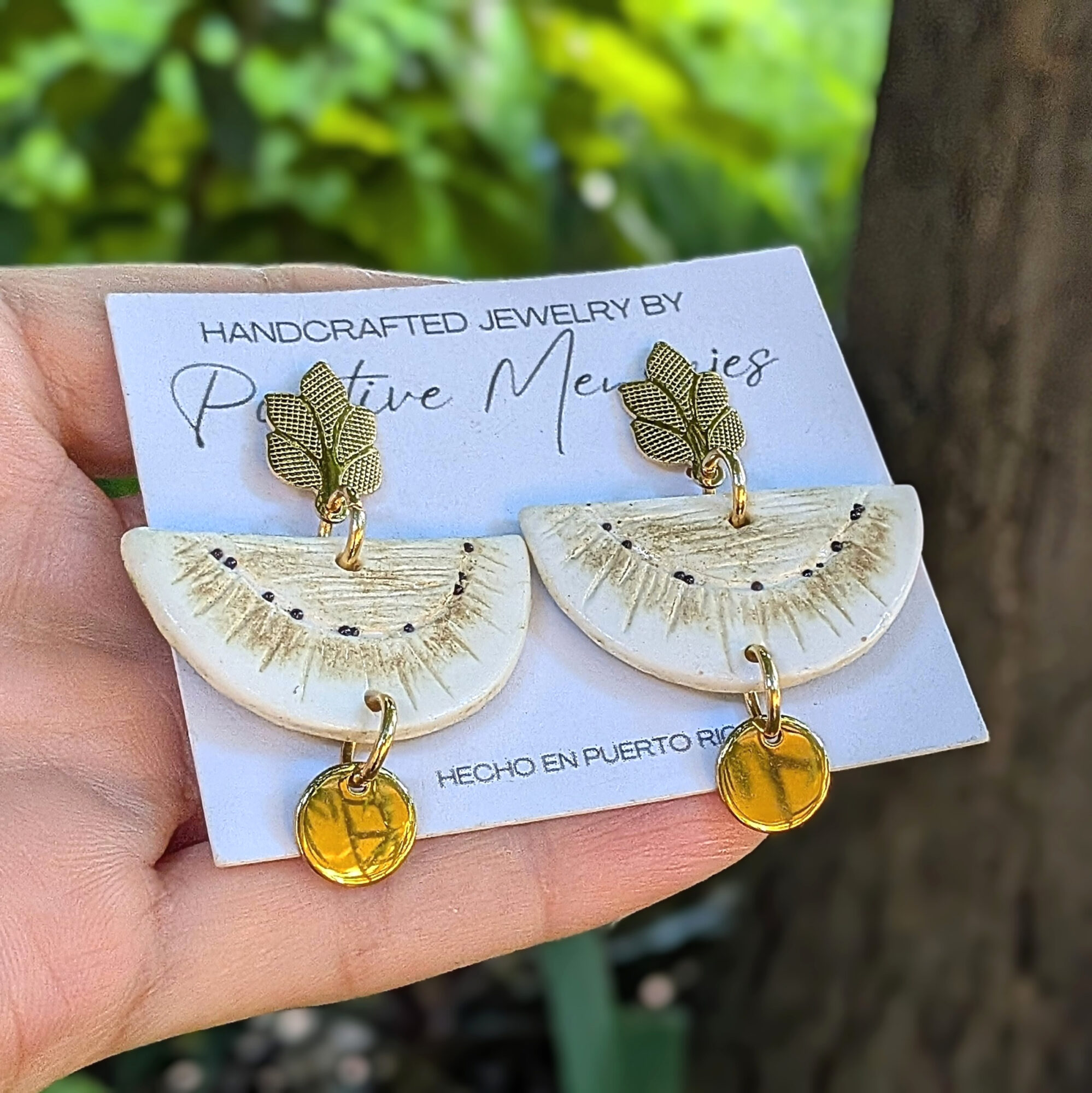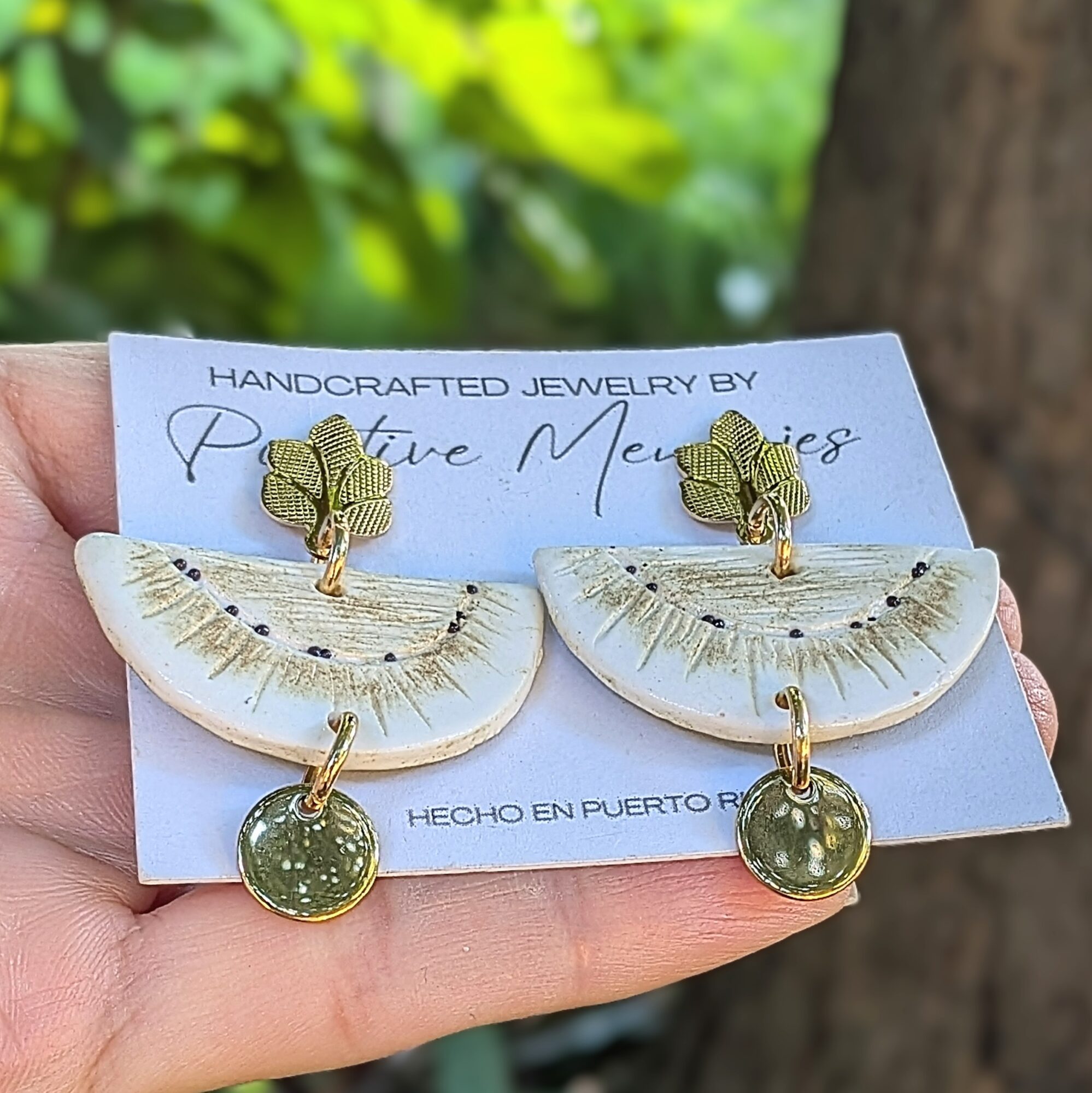 Handmade earrings inspired by the Pana fruit, also known as Panapen in Puerto Rico and breadfruit in English. The half pana design features handcarved details on both sides with off-white and brown tones on the front, subtle seed details, and a textured green back. A gold-colored stainless steel tree post adds an elegant touch, while a round pendant enhances the boho-inspired style. Lightweight and stylish.