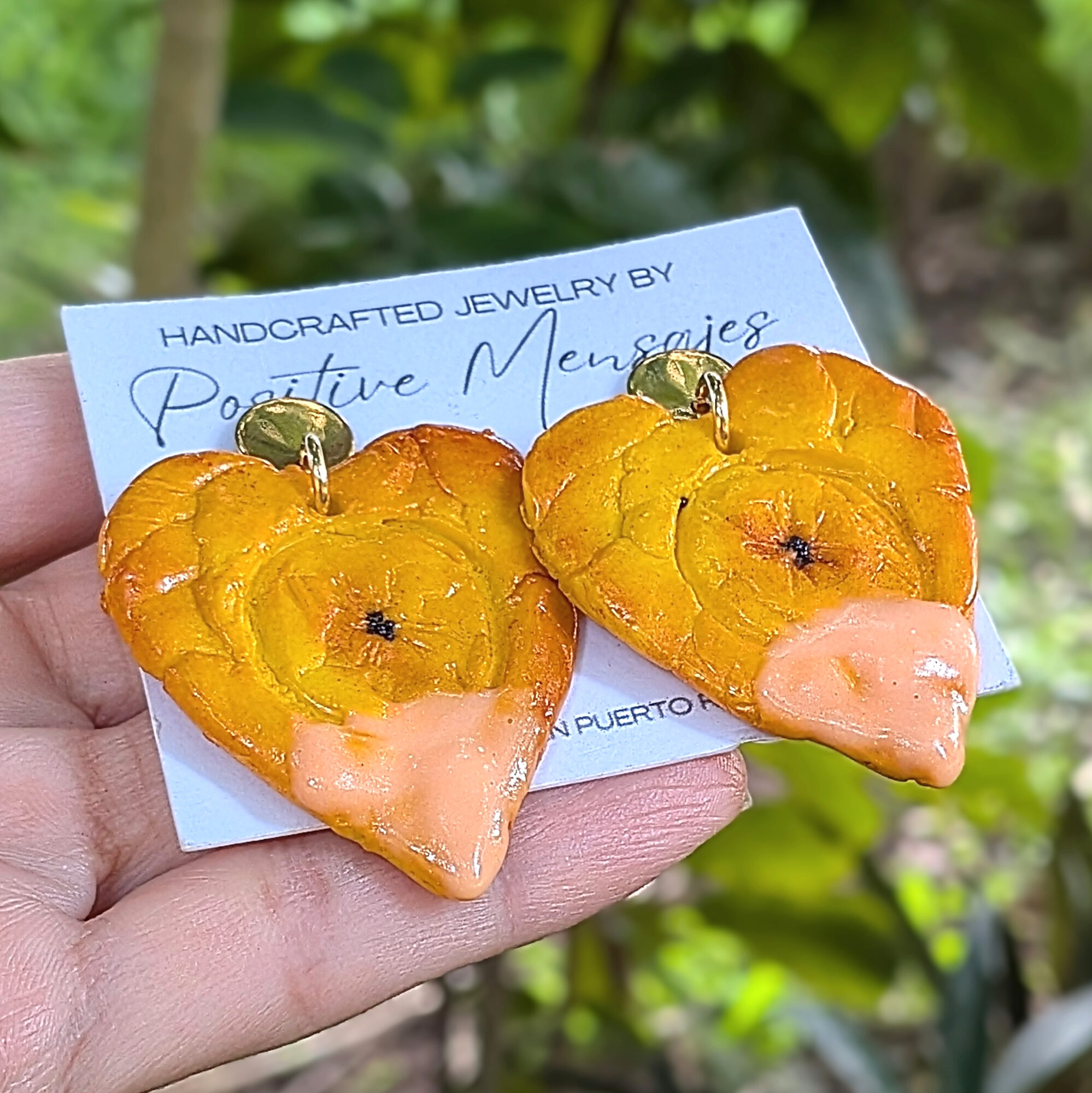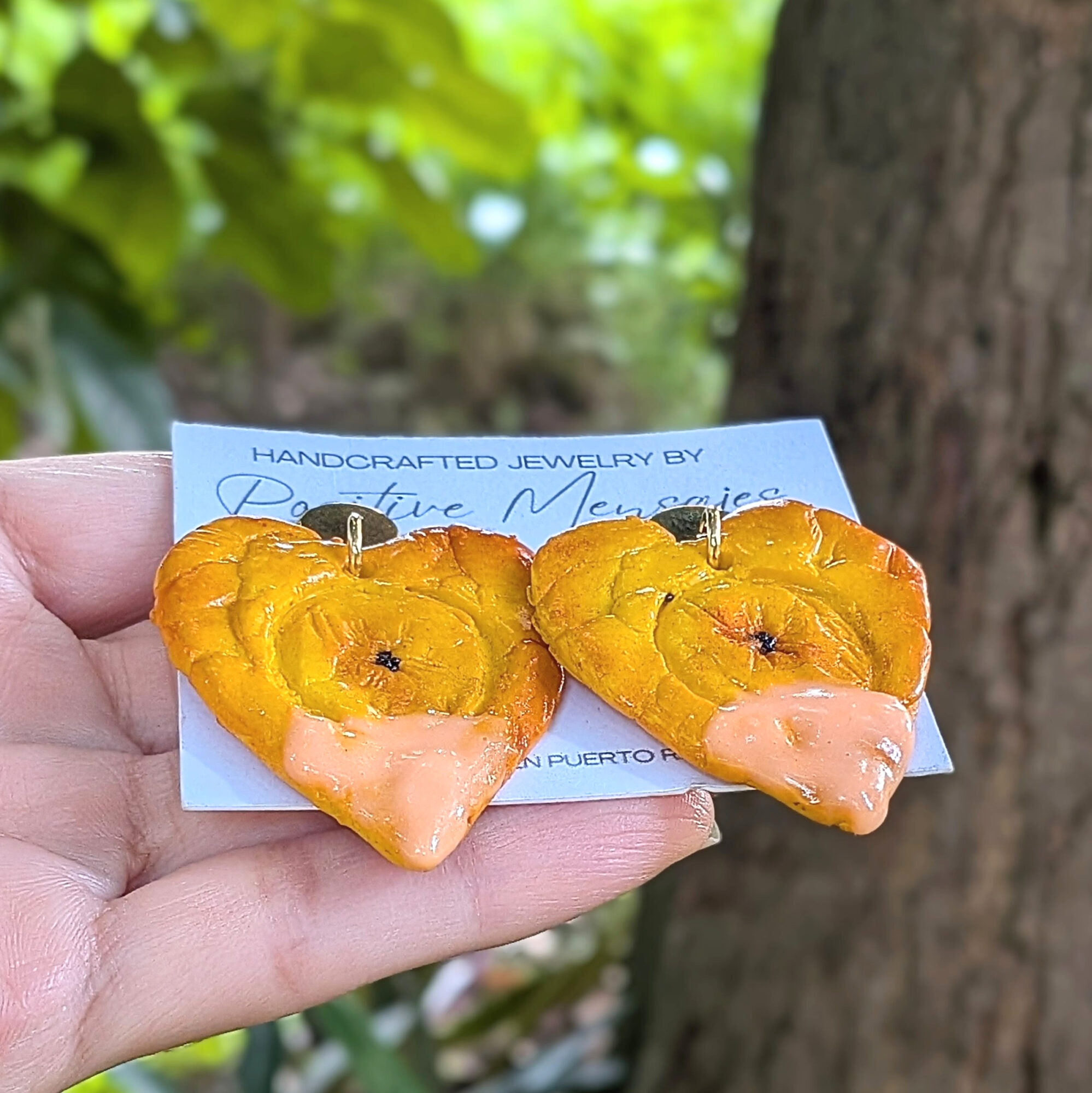 Bring the fun of Puerto Rico’s favorite snack to your style with these heart-shaped Tostones earrings! Handmade from polymer clay and hand-carved for realistic detail, they capture crispy Tostones (or Patacones) dipped in the island’s famous mayo-ketchup sauce. Inspired by a beloved treat across Latin America, these earrings celebrate playful flavors and island culture.