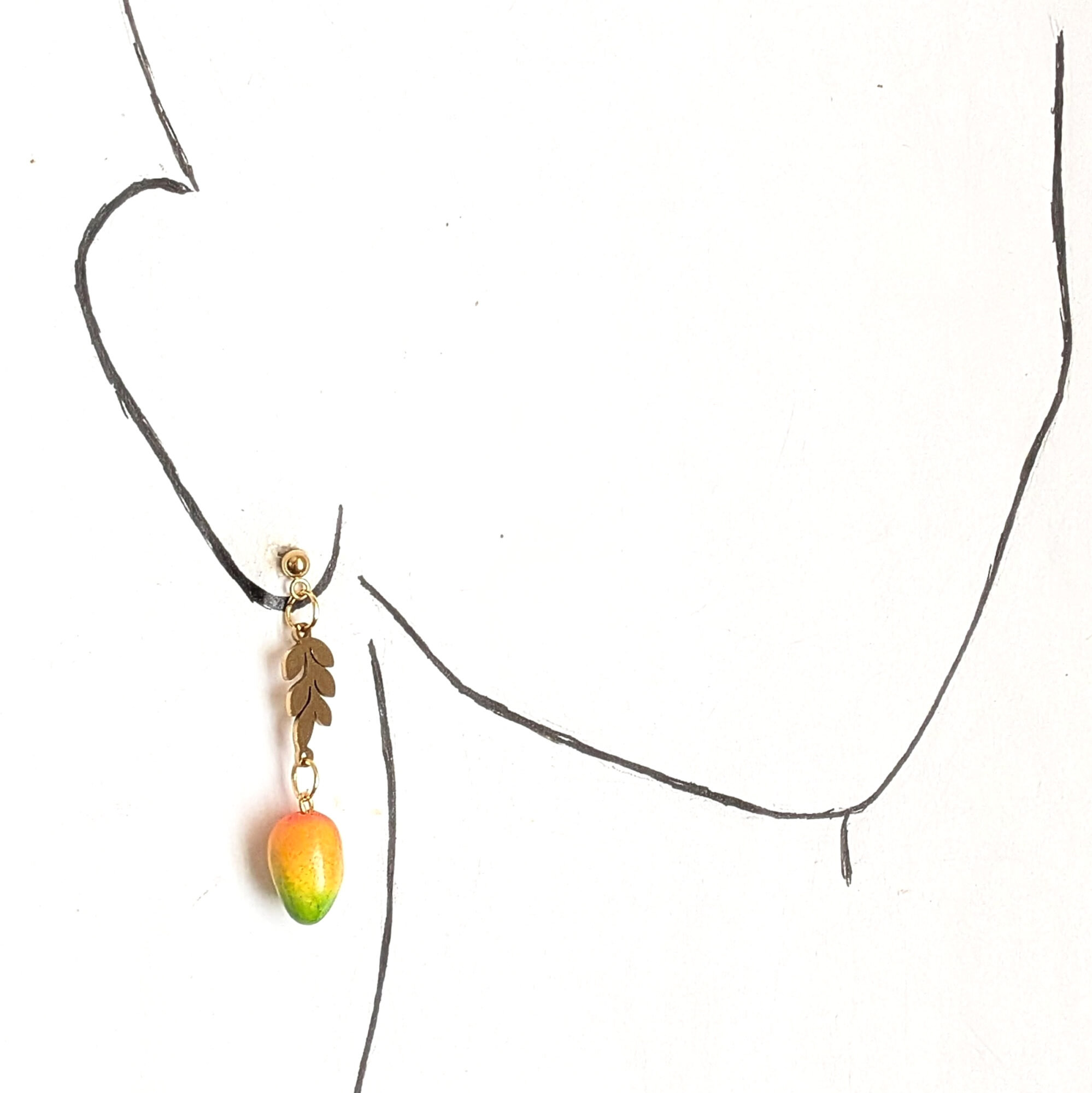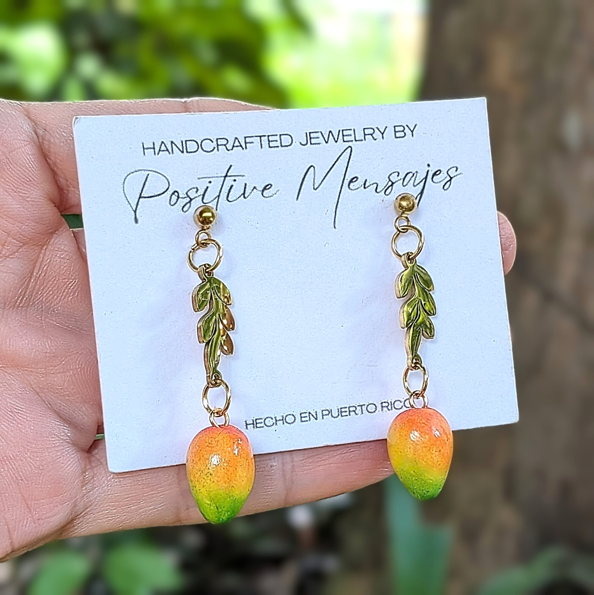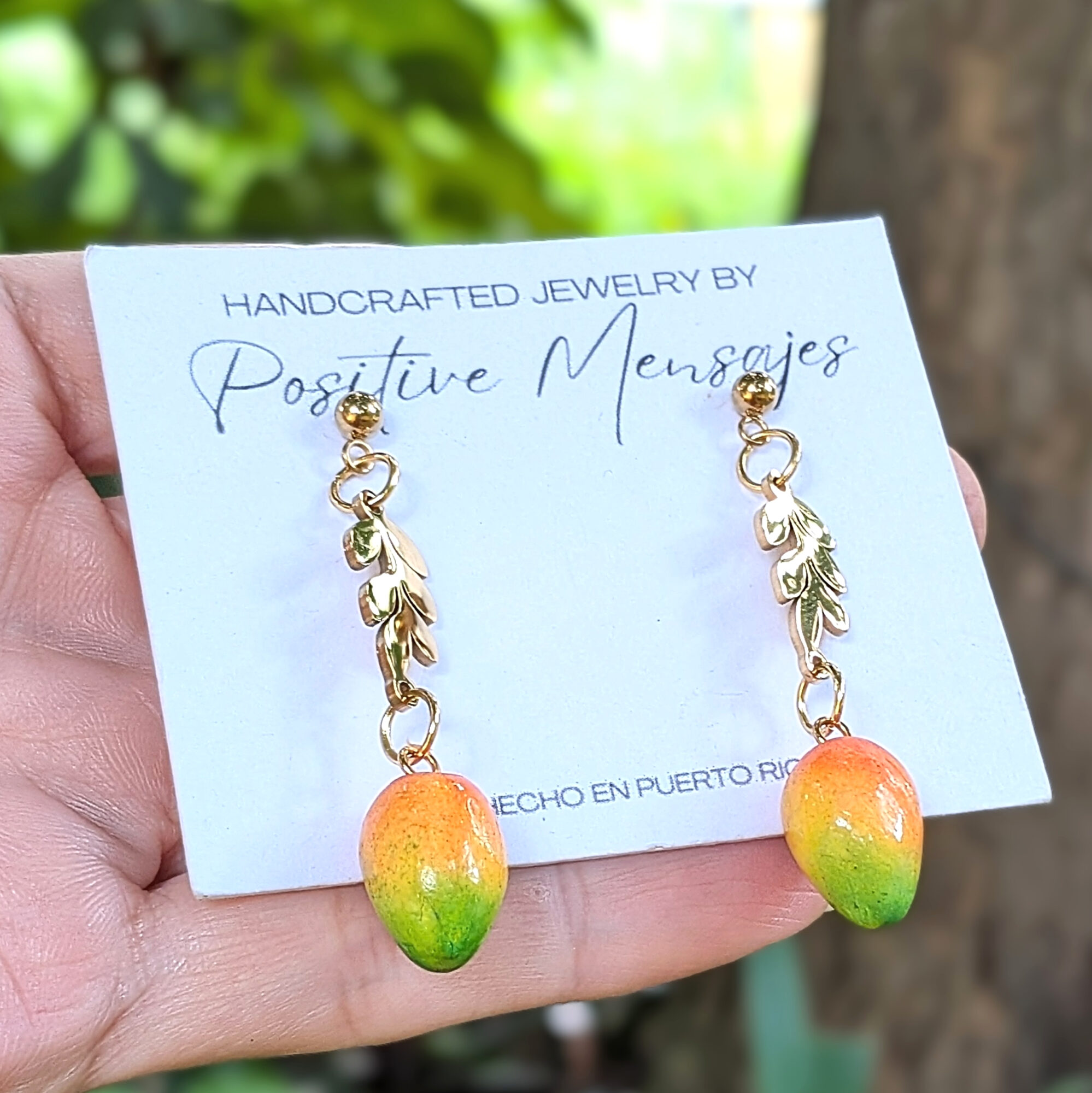 Celebrate a beloved tropical fruit with these handcrafted mango earrings. Miniature mangoes in shades of orange, yellow, and green hang from golden stainless steel leaves, inspired by the ones in our island. Each pair adds a soft island touch to your style while capturing the love for this favorite fruit. The mangoes are finished with varnish and feature subtle natural speckling for a realistic look.