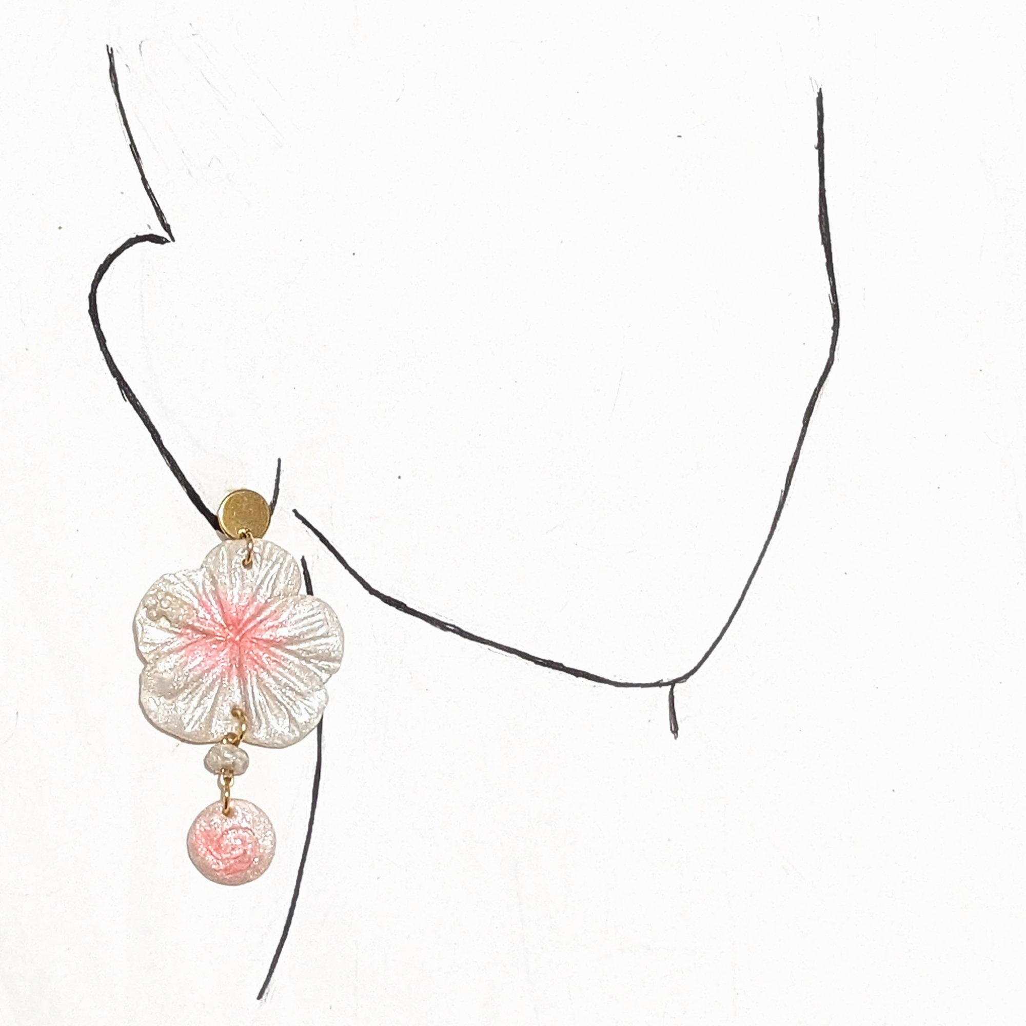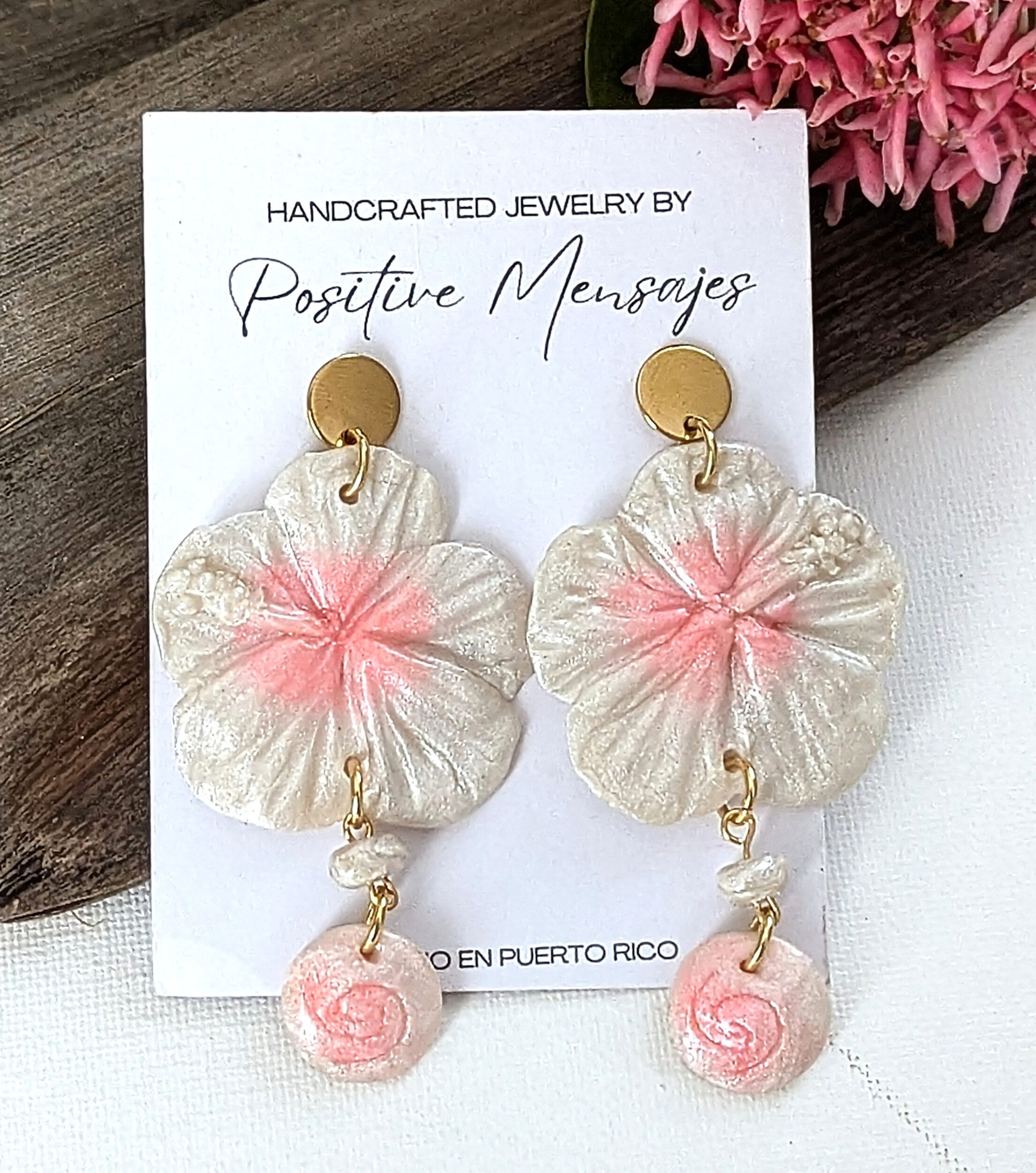 These earrings take the shape of Puerto Rico’s national hibiscus flower, the Flor de Maga. Their shimmery pearl color with soft pink tones reflects the natural beauty of the coast, inspired by pink seashells and the gentle hues of the shoreline. A round bead features a hand-carved spiral design inspired by the Taíno water and snail symbol, adding a meaningful connection to the island’s culture.