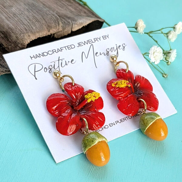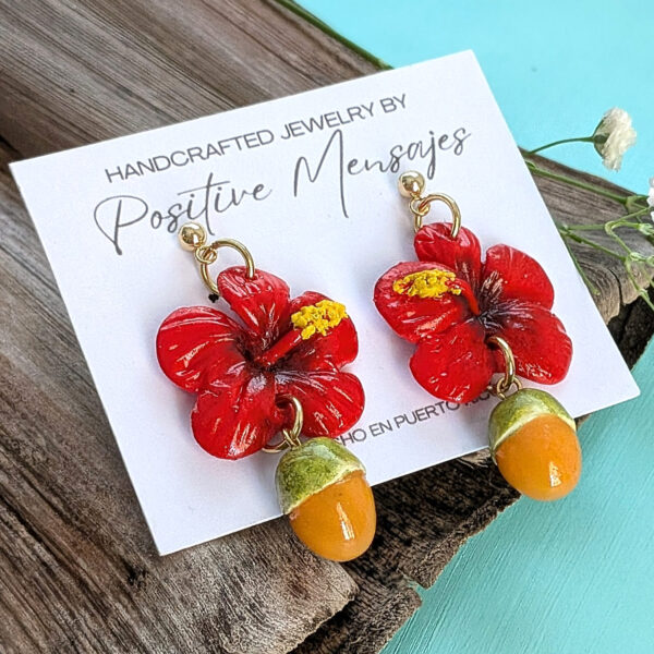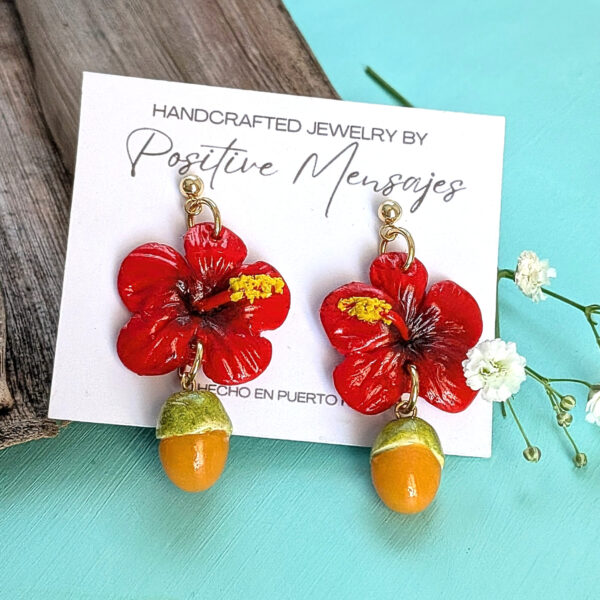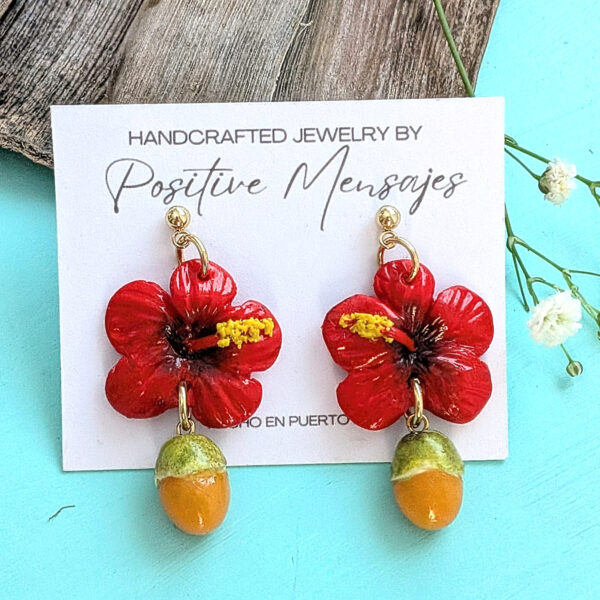 Show your love for the island with these Quenepa-style earrings from Puerto Rico. The flower on top represents both the national Flor de Maga and the red hibiscus (Amapola) flower, while the hanging quenepa celebrates this favorite local fruit. Handmade from polymer clay and sealed with varnish, they hang from golden round post studs. Give as a gift to someone who misses the island or wear them to celebrate your Boricua pride.