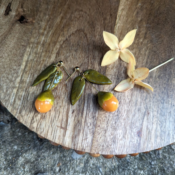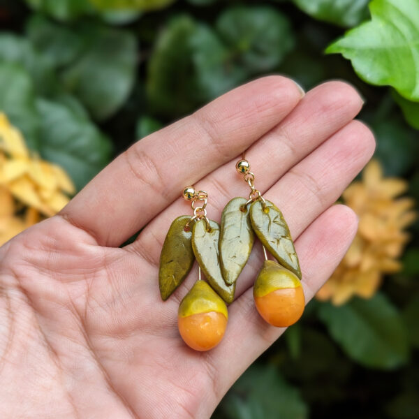 The earrings resemble this tangy fruit hanging low with it leaves. Each is made to look unique in their own way. They will show a slight difference in size, color and/or details.