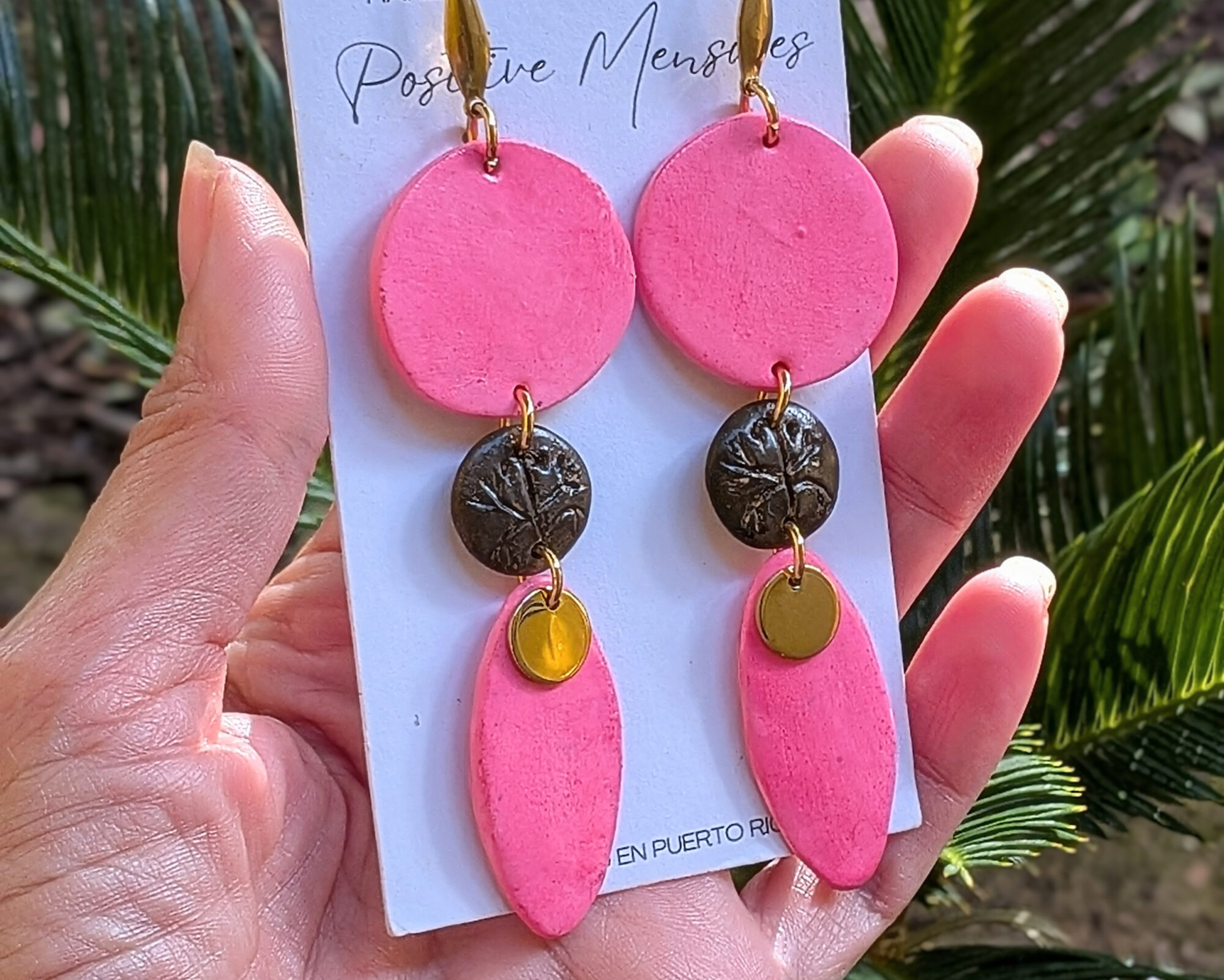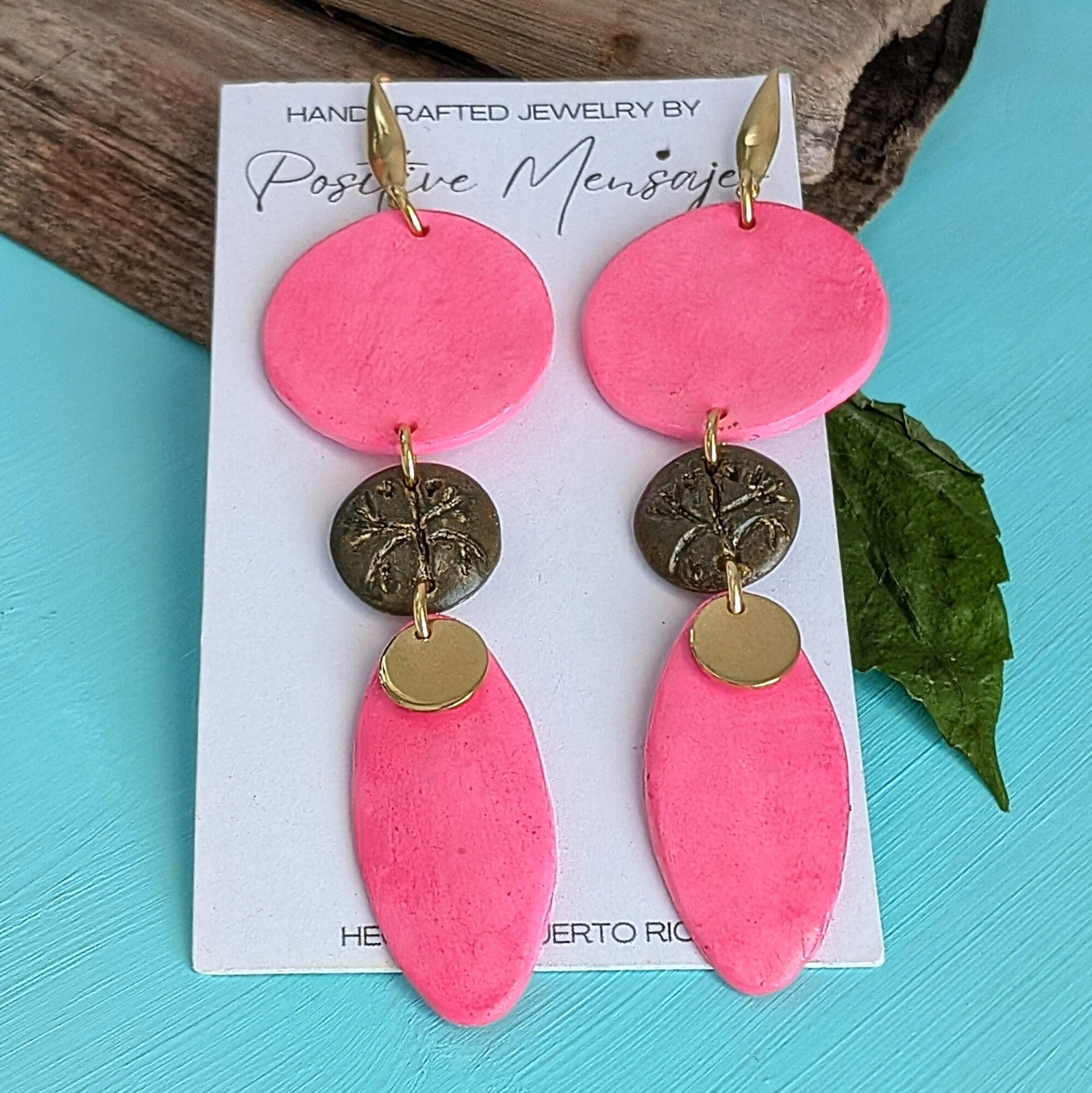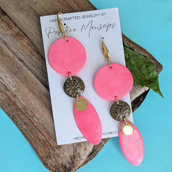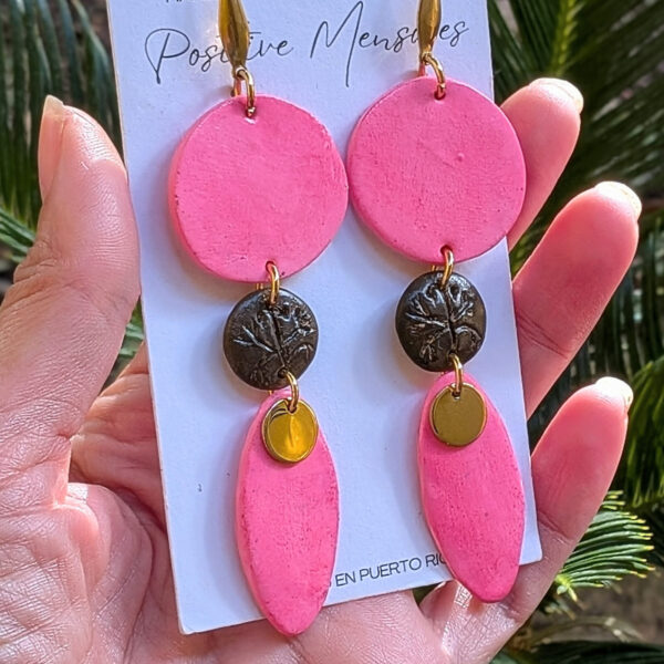 Celebrate Taino heritage with these earrings, handcrafted in Puerto Rico. They feature a brown hand-carved Coqui on a mini round center set against a bright pink tone. The indigenous-inspired shape includes round post studs and a small golden leaf charm, creating a long, stylish, and eye-catching design. Made of polymer clay sealed with varnish, the earrings include gold-colored stainless steel components.
