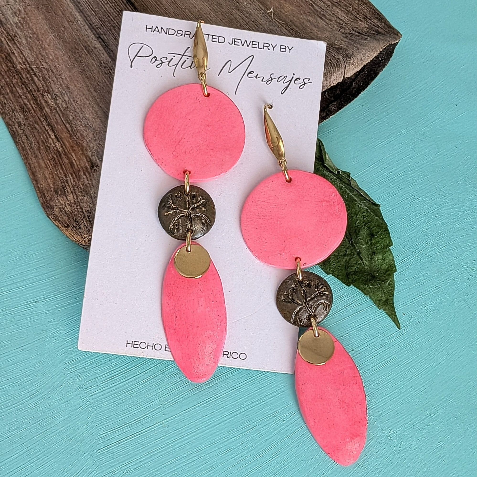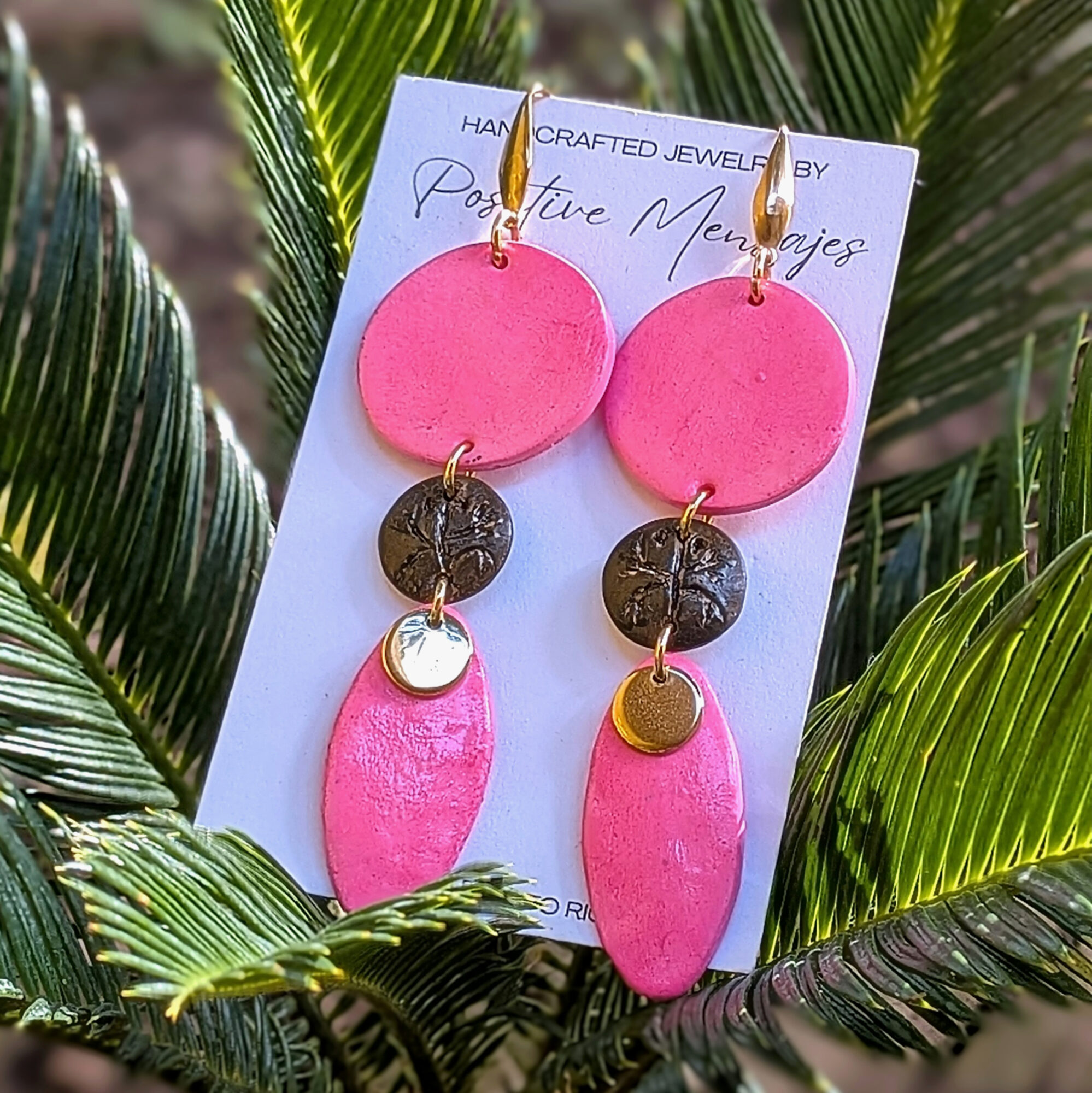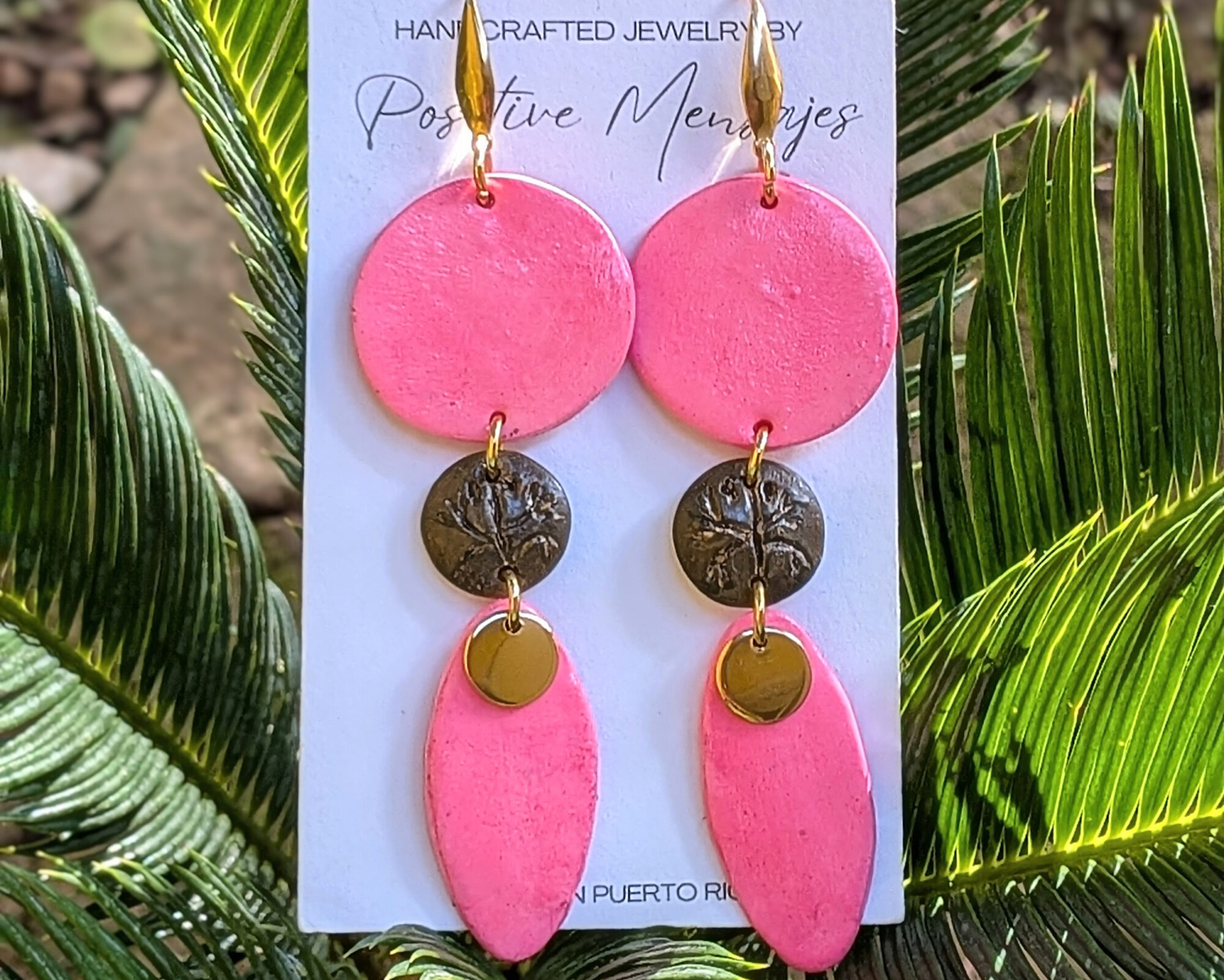 Celebrate Taino heritage with these earrings, handcrafted in Puerto Rico. They feature a brown hand-carved Coqui on a mini round center set against a bright pink tone. The indigenous-inspired shape includes round post studs and a small golden leaf charm, creating a long, stylish, and eye-catching design. Made of polymer clay sealed with varnish, the earrings include gold-colored stainless steel components.